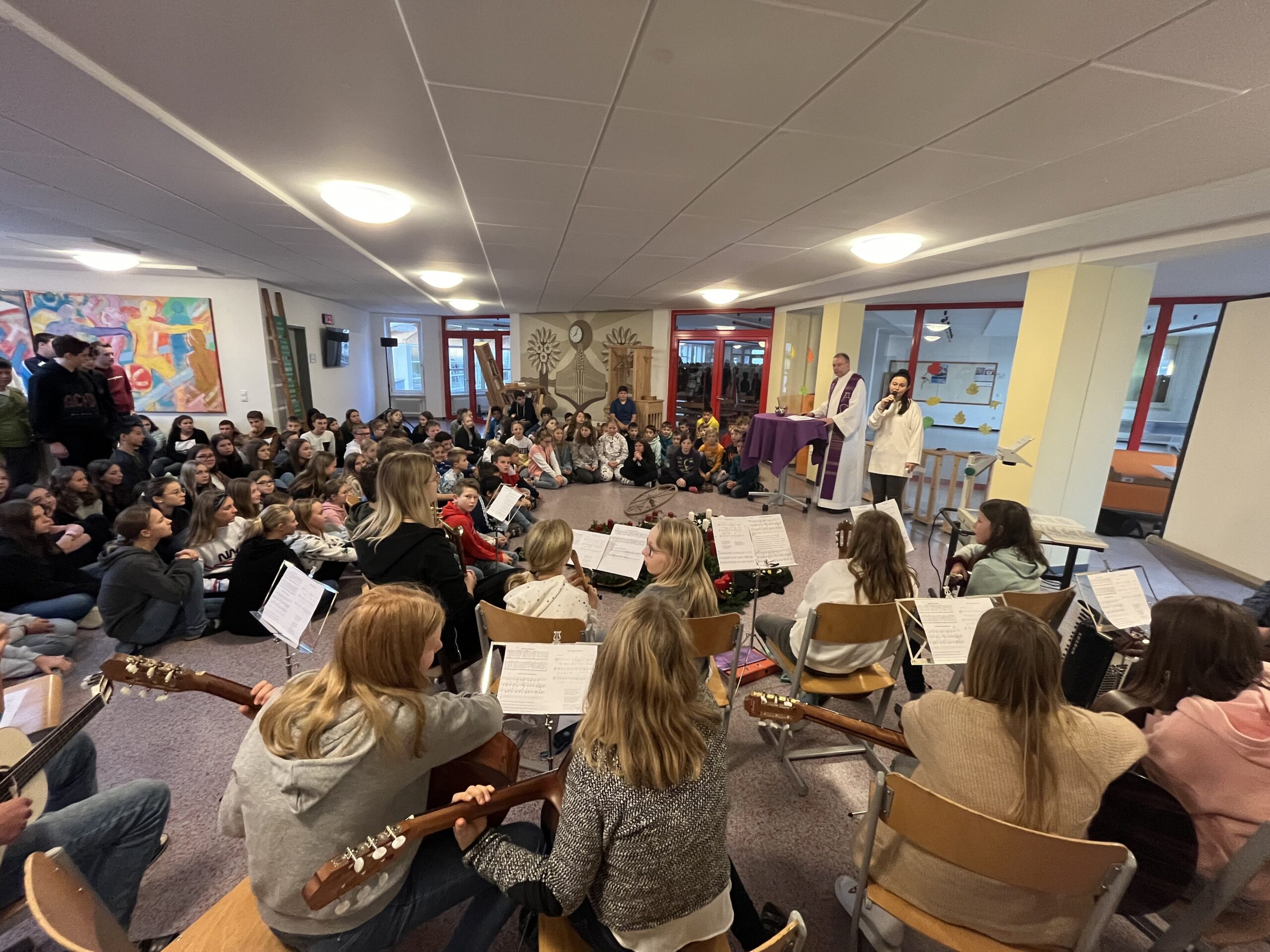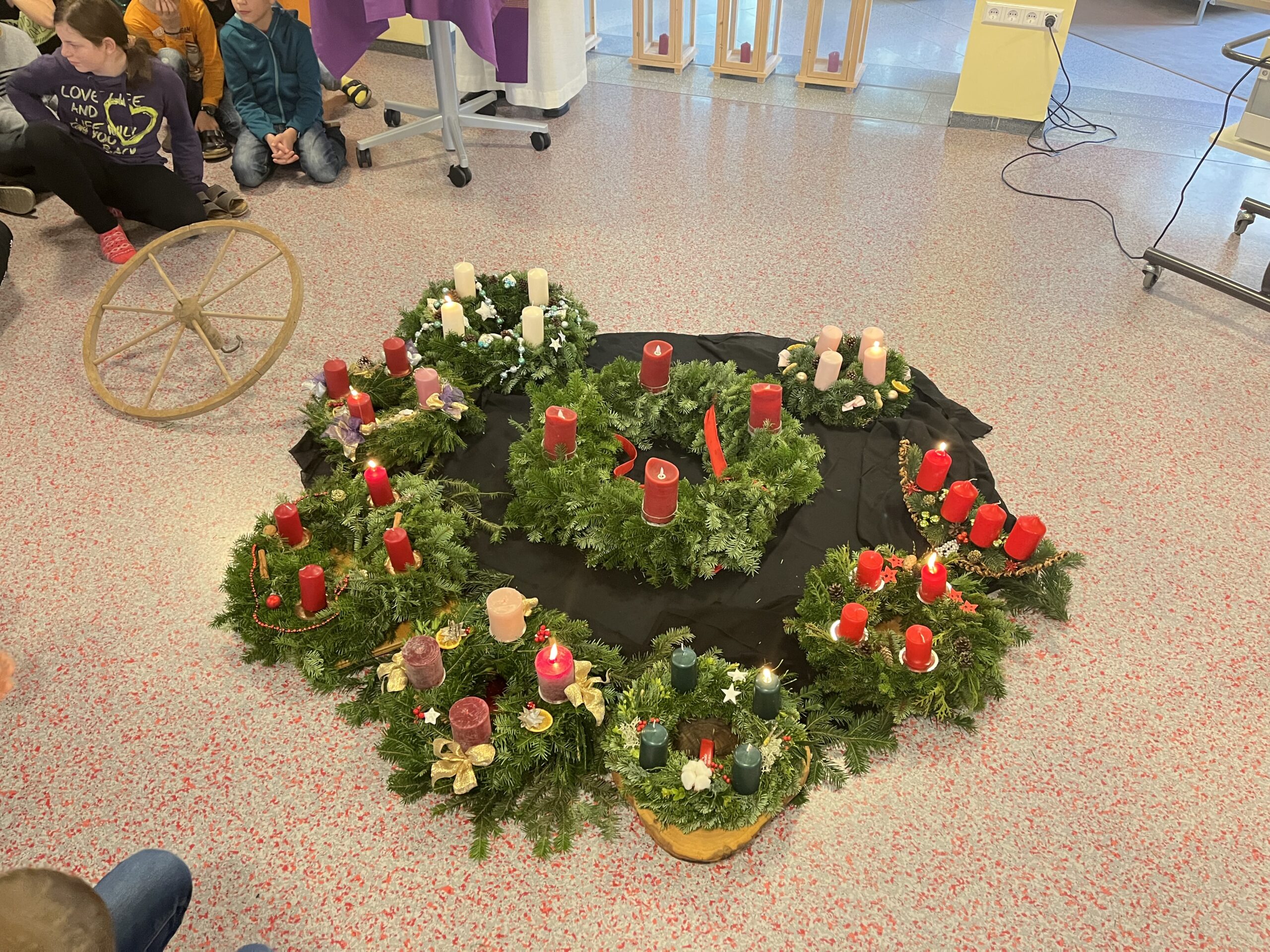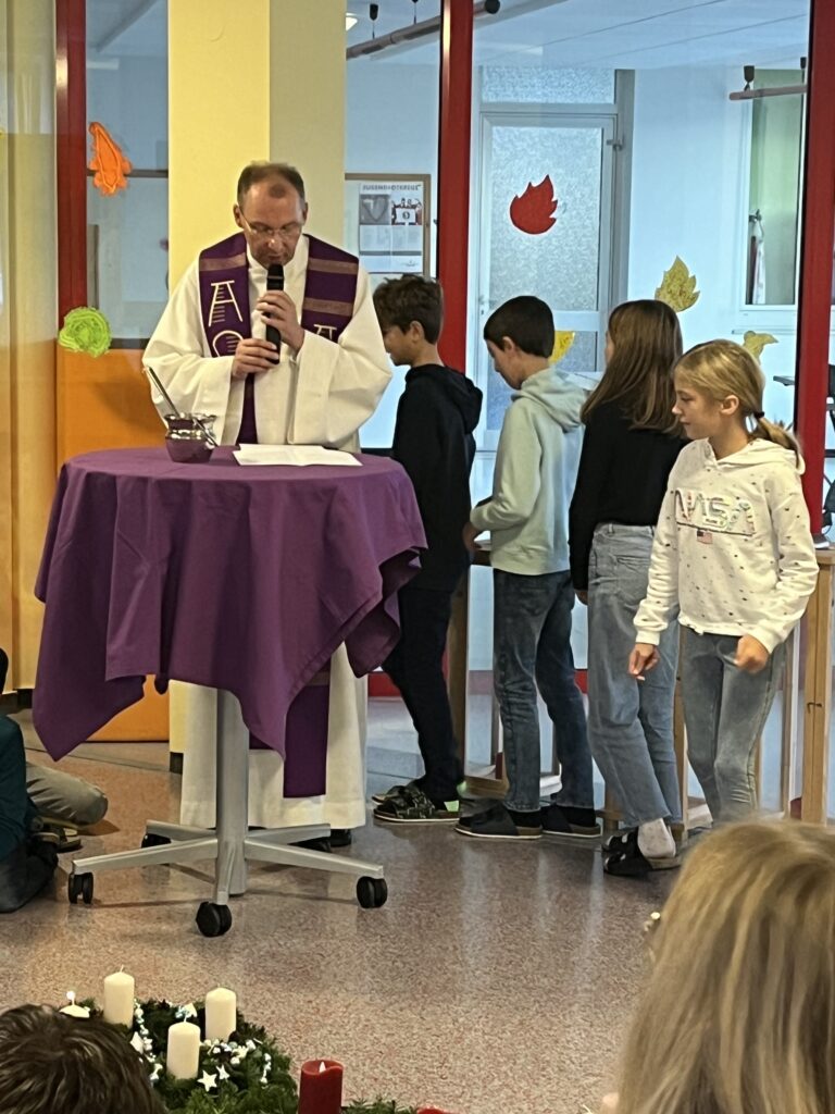 Am ersten Adventmontag wurden von unserem Herrn Pfarrer Florian im Rahmen einer Adventbesinnung die Adventkränze unserer acht Klassen geweiht. Schülerinnen und Schüler bereiteten Texte und Musikstücke vor, welche während der Adventkranzweihe vorgetragen wurden. So konnten wir in einer Geschichte erfahren, wie es zu den vier Kerzen am Adventkranz gekommen ist. Frau Bauer hat mit allen Schülerinnen und Schülern die Feierstunde vorbereitet, sodass sich bereits schon jetzt ein besinnliches Vorweihnachtsgefühl ausbreitete. Wir freuen uns auf die weiteren Adventbesinnungen, jeweils an den Montagen vor Schulbeginn im Advent.
