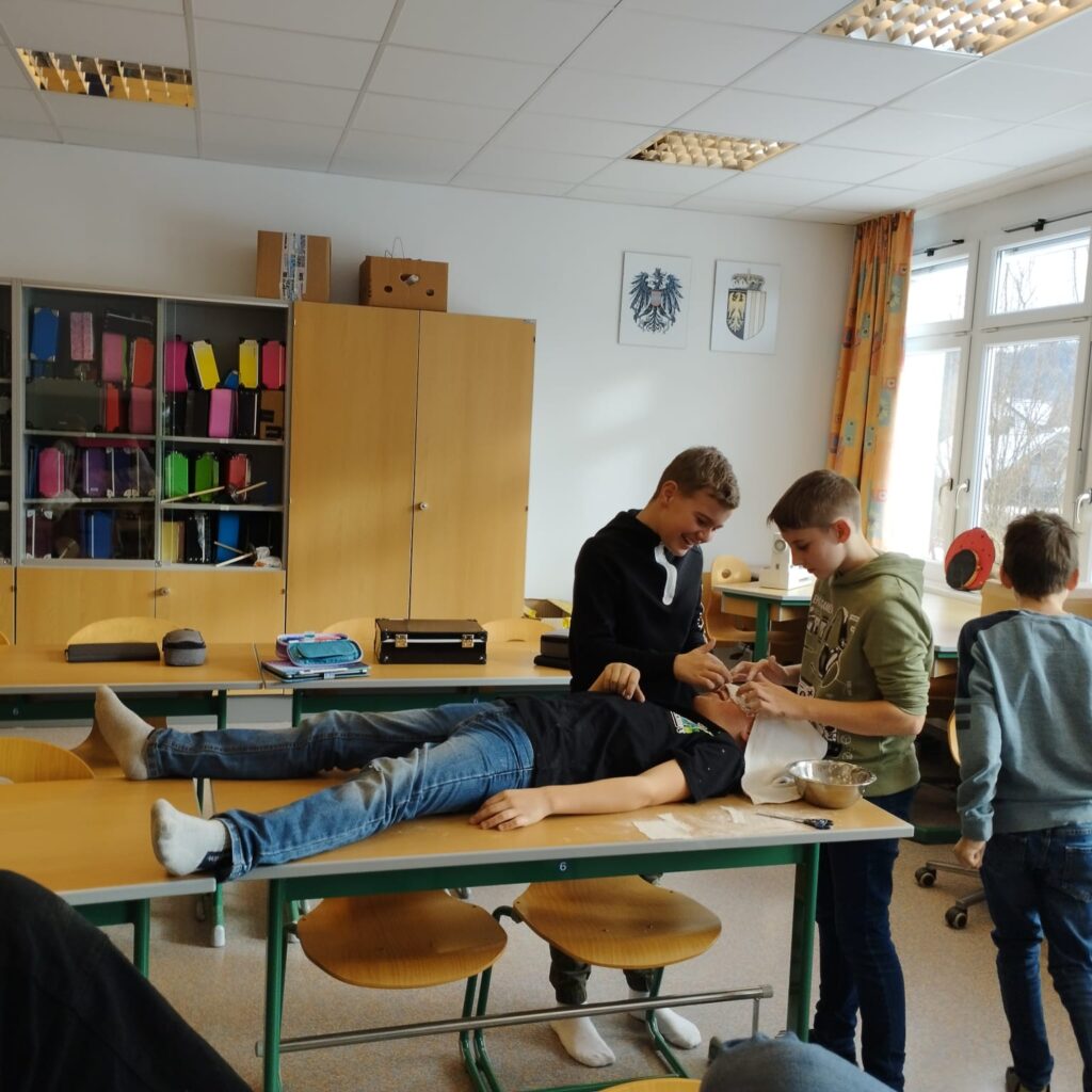 Passend zum bevorstehenden Fasching fertigte eine Werkgruppe der 1B Gipsmasken an. Das Material der medizinischen Gipsfaschen ist eine interessante Kombination aus textilem Gewebe und Gips. Um es formbar zu machen, müssen die Faschen zuerst zerkleinert, dann eingeweicht und anschließend in die richtige Position gebracht werden, dort härten sie aus. Um dies durchzuführen wurde der textile Werkraum in eine Art Kosmetikstudio verwandelt. Die Burschen und Mädls modellierten perfekt angepasste Masken. Mit Federn, Perlen, Farben und Stoffen entstanden originelle Faschingsaccessoires.