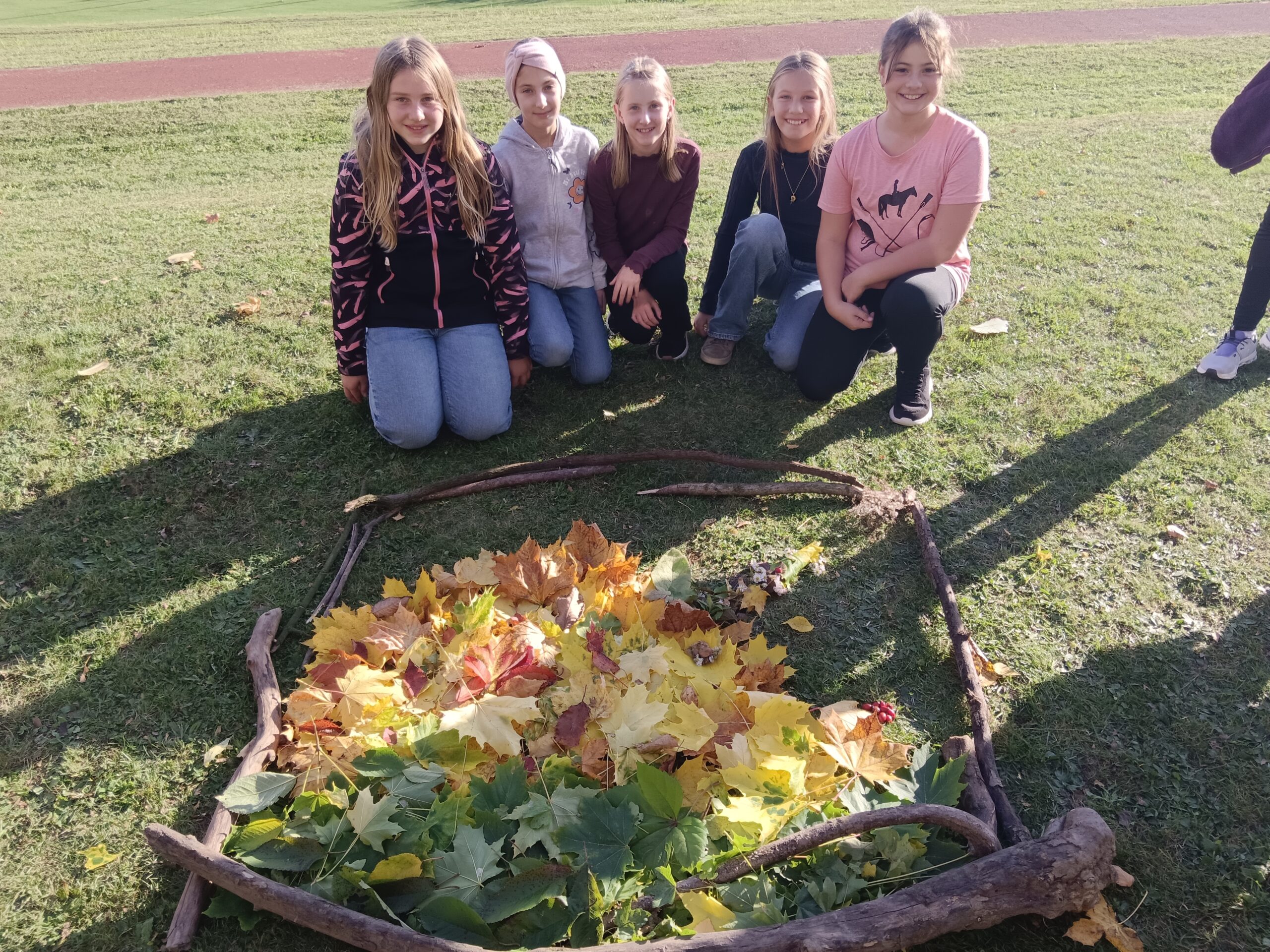 Die Schülerinnen und Schüler der 1a Klasse gestalteten im Unterrichtsfach „Kunst und Gestaltung“, im Rahmen eines Projektes, Bilder mit Naturmaterialen. Dazu begaben sie sich auf die Suche nach bunten Blättern, Zweigen, Steinen, Blüten … mit denen sie Kunstwerke auf den Rasen legten. Dabei war nicht nur Kreativität, sondern auch Teamgeist gefragt.