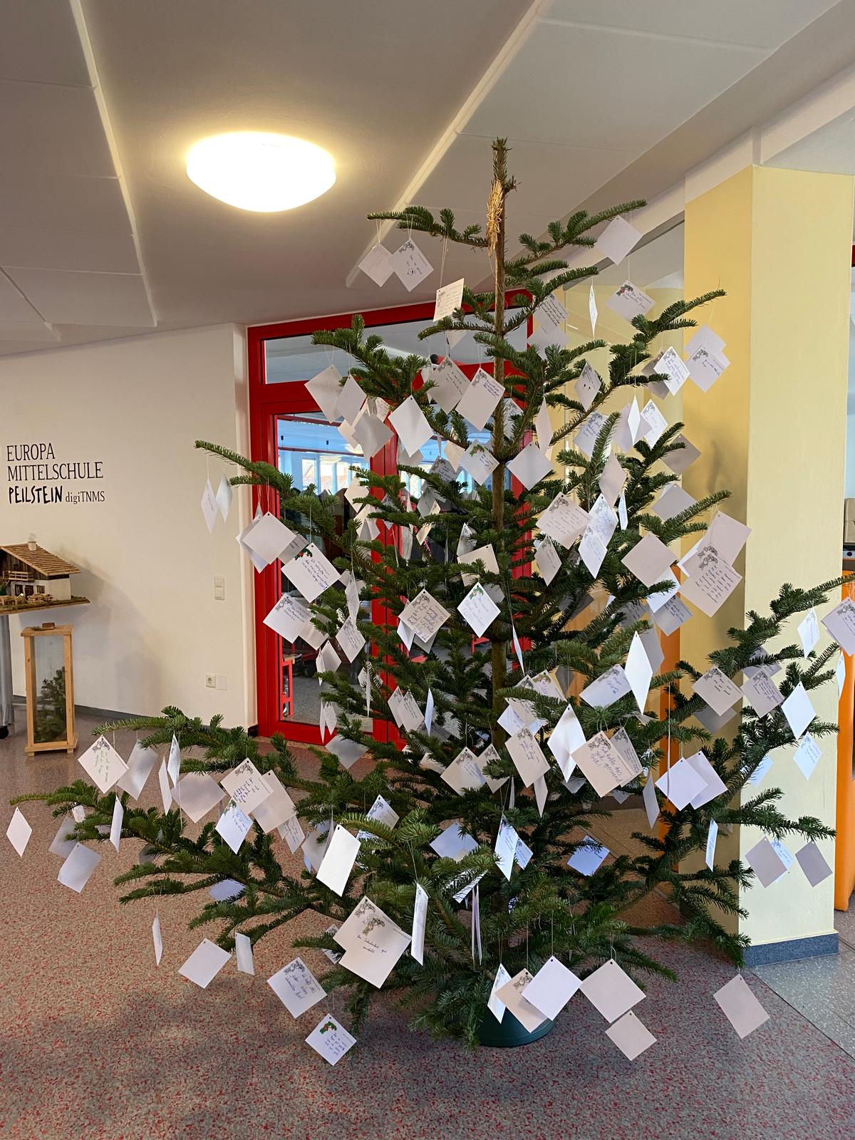 Bereits seit Adventbeginn ziert ein großer "Hoffnungsbaum" unser Foyer. Die SchülerInnen behängen ihn Tag für Tag mit Kärtchen, auf denen sie ihre unbezahlbaren Herzenswünsche schreiben. Inzwischen ist er über und über voll. Mit dieser Aktion fördern wir das Hoffen und den Glauben an das Gute. Schön, dass sich so viele dafür begeistern lassen und ein herzliches Dankeschön an die Familie Scharinger für die Spende des Baumes. Beim Weihnachtsgottesdienst werden wir all die Kärtchen in eine Holzkrippe legen und an Stelle der Fürbitten vorbringen.